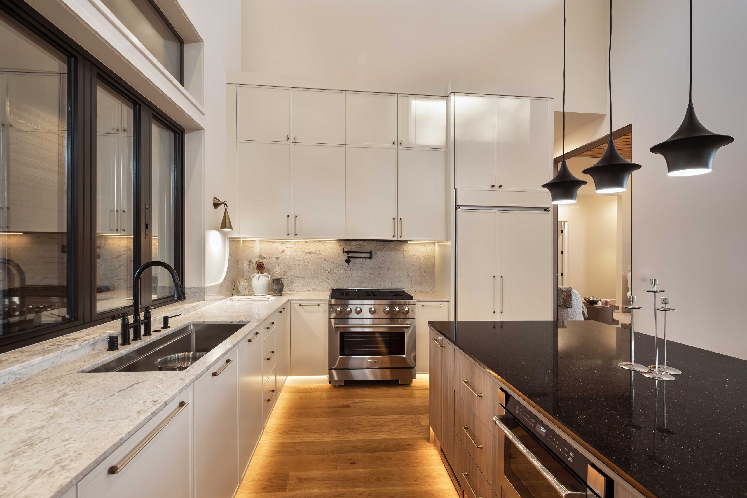 The interior features spacious living areas, high ceilings, and expansive windows that invite natural light while framing the surrounding landscape. Each of the four bedrooms is designed as a private sanctuary, complemented by five well-appointed bathrooms that emphasize both function and luxury. The home’s layout supports both everyday living and entertaining, with an open-concept flow that connects the kitchen, dining, and living spaces effortlessly.