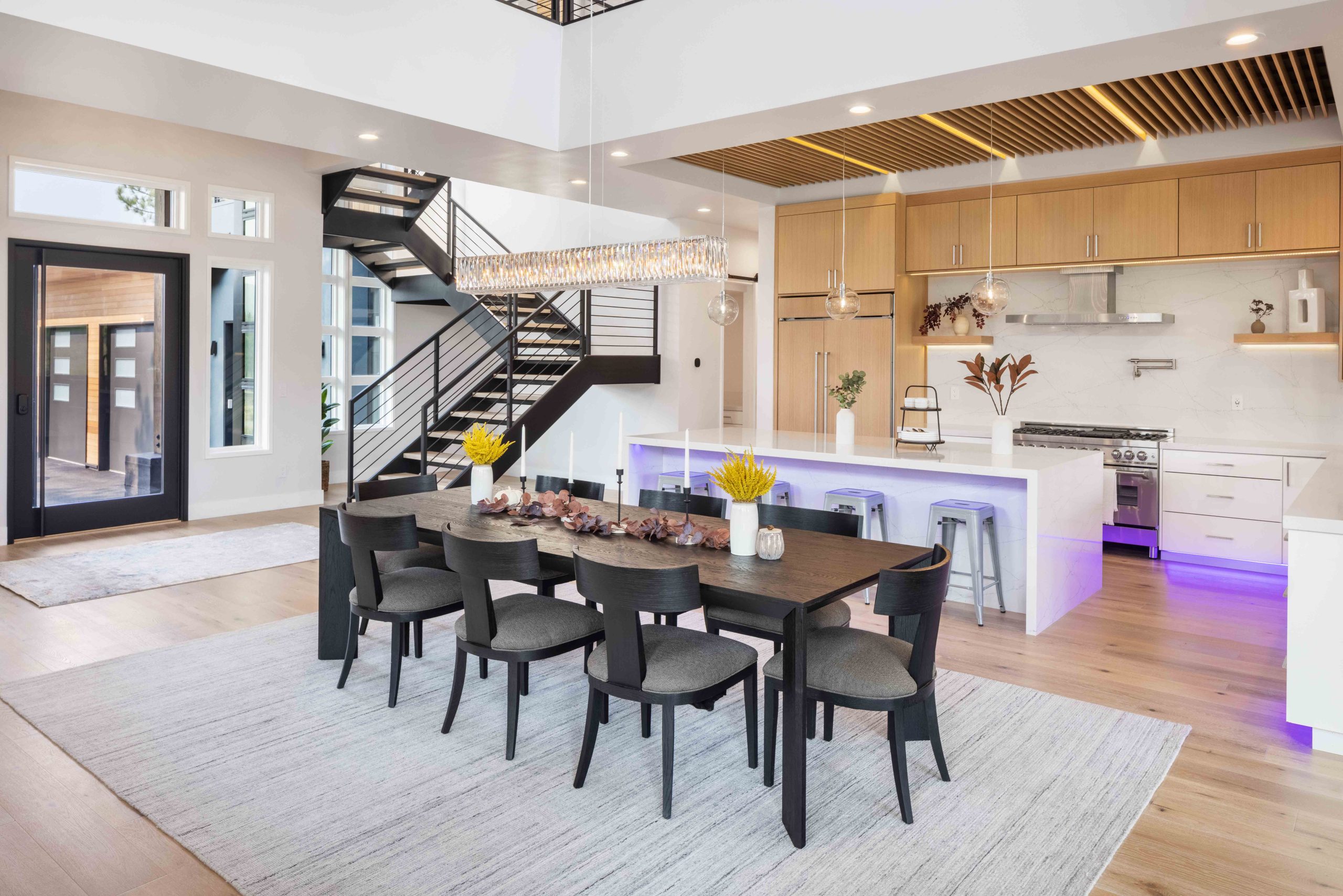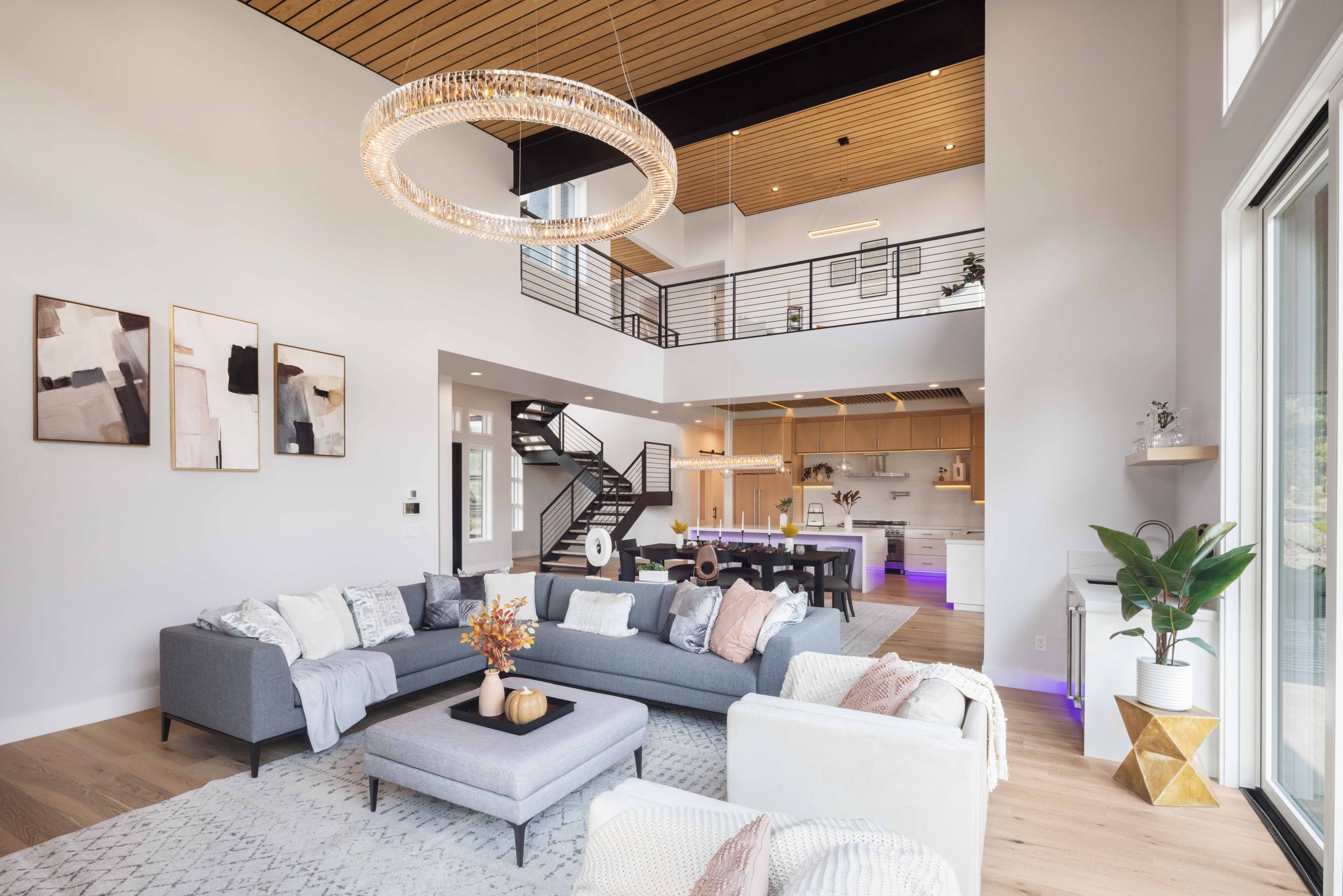 The great room’s soaring wood ceiling, sculptural black fireplace, and floating staircase create a breathtaking architectural statement bold yet beautifully balanced. At the heart of the home, a chef’s kitchen pairs crisp quartz surfaces and a dramatic waterfall island with warm wood cabinetry, achieving a perfect blend of artistry and function. A private media lounge and four luxurious bedrooms, each with its own en suite bath, offer versatility and comfort for family and guests alike.